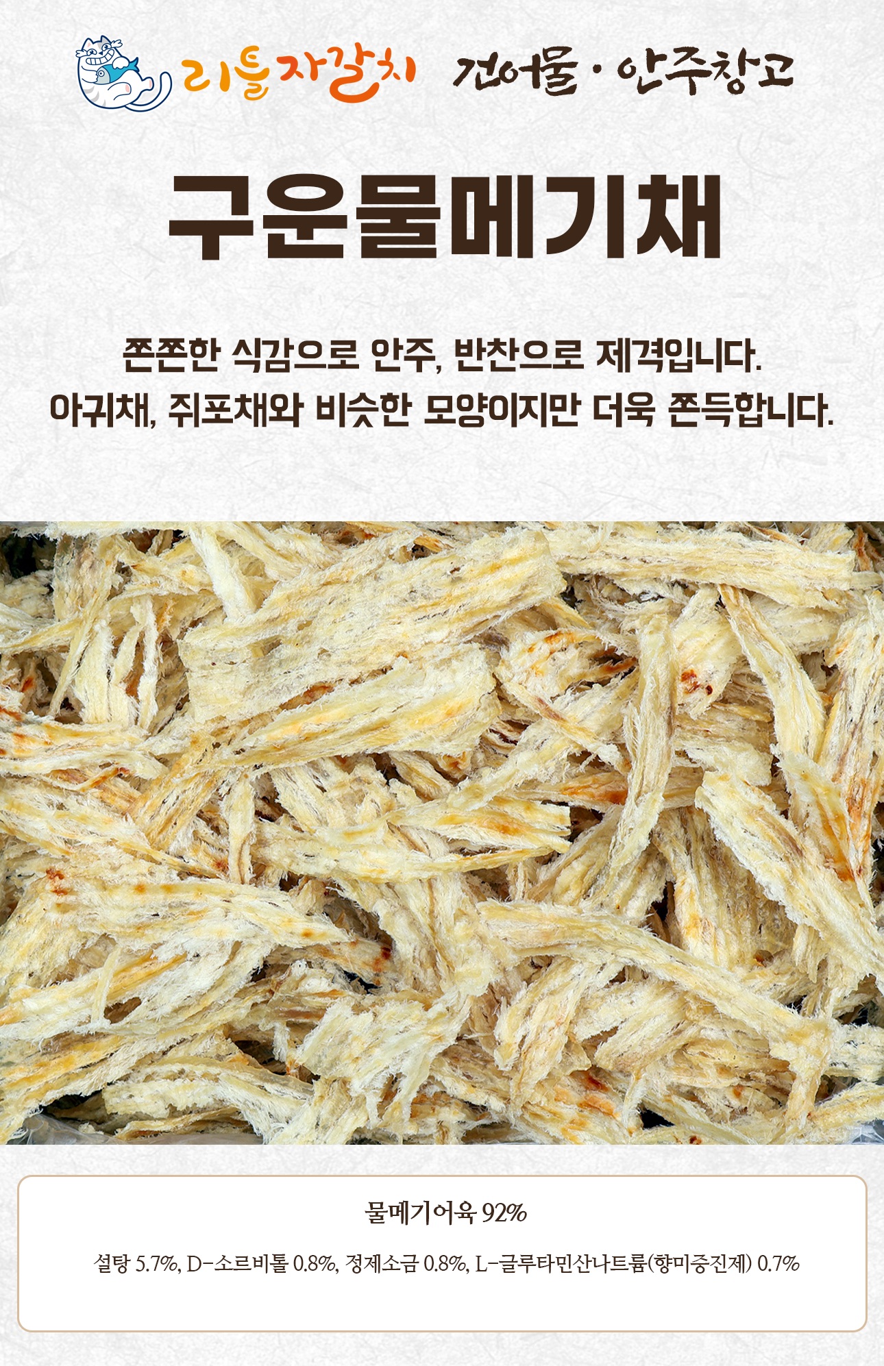 물메기어육92%, 설탕5.7%, D-소르비톨0.8%,정제소금0.8%, L-글루타민산나트륨(향미증진제)0.7%