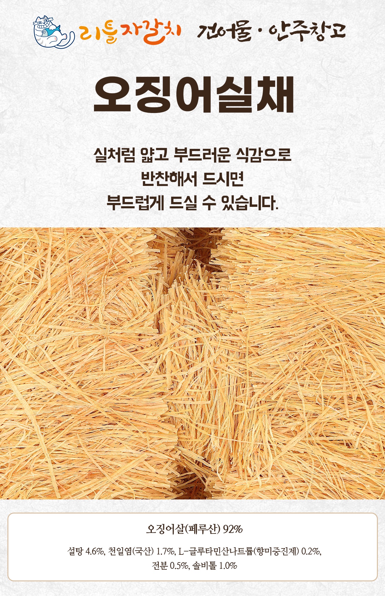 오징어살(페루산) 92%, 설탕 4.6%, 천일염(국산) 1.7%, L-글루타민산나트륨(향미증진제) 0.2%, 전분 0.5%, 솔비톨 1.0%