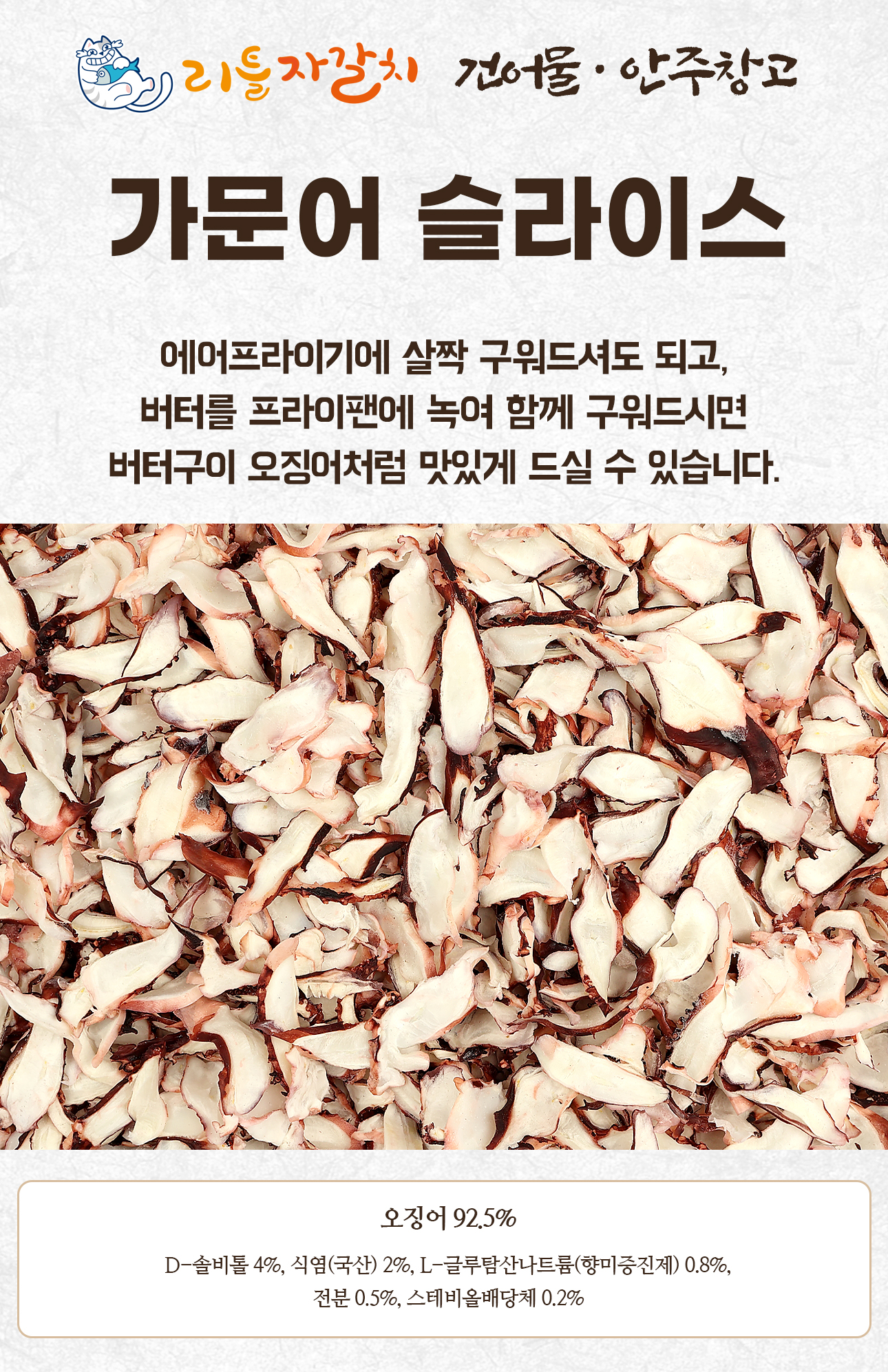 오징어 92.5%, D-솔비톨 4%, 식염(국산) 2%, L-글루탐산나트륨(향미증진제) 0.8%, 전분 0.5%, 스테비올배당체 0.2%