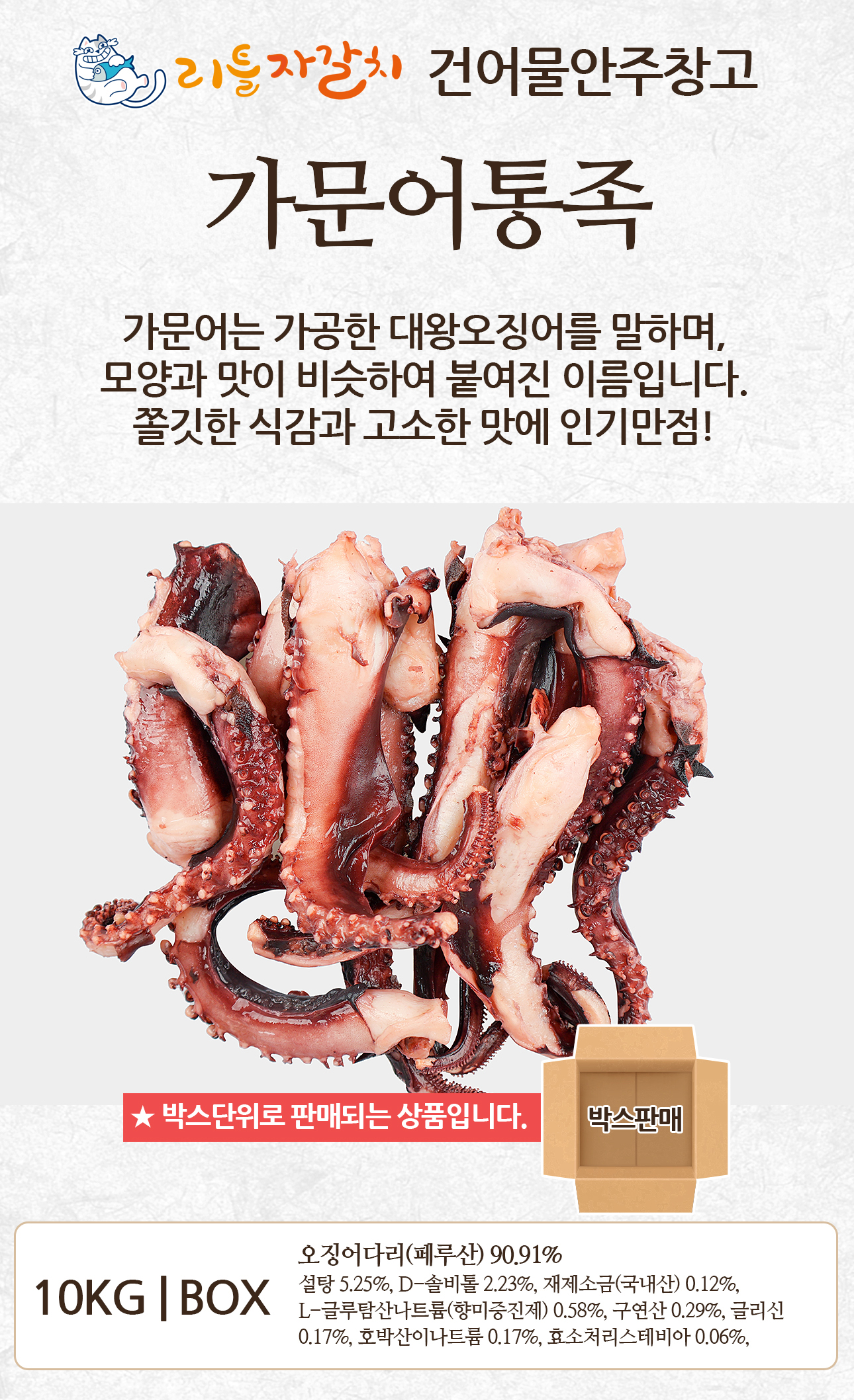 오징어다리(페루산) 90.91%, 설탕 5.25%, D-솔비톨 2.23%, 재제소금(국내산) 0.12%, L-글루탐산나트륨(향미증진제) 0.58%, 구연산 0.29%, 글리신 0.17%, 호박산이나트륨 0.17%, 효소처리스테비아 0.06%, DL-알라닌 0.12%